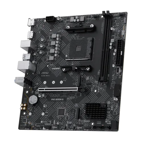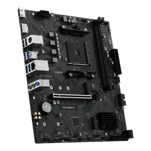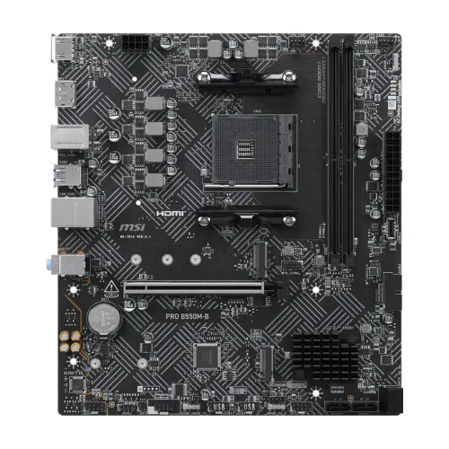 The MSI PRO B550M-B Motherboard is a dependable and efficient MSI AMD Motherboard designed for mainstream PC builders who want stability, performance, and essential features at a great value. Built on the AMD B550 chipset with support for the AM4 socket, it is fully compatible with a wide range of AMD Ryzen 3000, 4000, and 5000 series processors, making it a versatile choice for gaming and productivity. With support for DDR4 memory up to 128GB and speeds reaching 4400+ MHz (OC), this MSI 550 Motherboard ensures smooth multitasking and fast responsiveness. It features PCIe 4.0 support for next-gen graphics cards and NVMe SSDs, delivering ultra-fast data transfer speeds and future-proof expansion. Storage options include M.2 slots with PCIe 4.0/3.0 support and multiple SATA ports, giving flexibility for both high-speed SSDs and traditional drives. Connectivity is practical with USB 3.2 Gen1 ports, HDMI and DVI-D outputs, and Gigabit LAN, ensuring stable networking and versatile display options. Enhanced with Core Boost technology, Audio Boost, and premium thermal solutions, the MSI PRO B550M-B provides reliable power delivery, improved sound quality, and efficient cooling for long-term durability. Compact in micro-ATX form factor, it fits easily into smaller cases while still offering robust functionality. Whether you’re building a budget-friendly gaming rig or a productivity workstation, the MSI PRO B550M-B Motherboard delivers dependable performance, essential features, and MSI’s trusted quality.