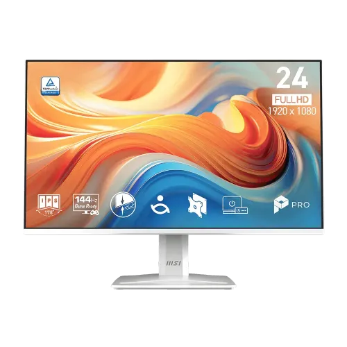 The MSI PRO MP243W E14 23.8" 144Hz IPS FHD White Gaming Monitor delivers smooth visuals, accurate colors, and modern design. This MSI 24 inch monitor combines a Full HD IPS panel with a 144Hz refresh rate and 1ms MPRT response time, making it a powerful MSI White Gaming Monitor for both productivity and immersive gameplay. Its sleek white finish and slim bezels add elegance to any setup.