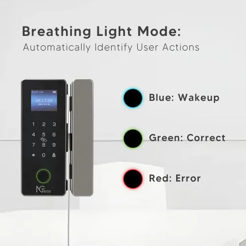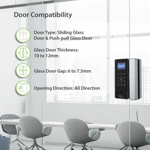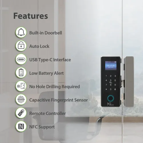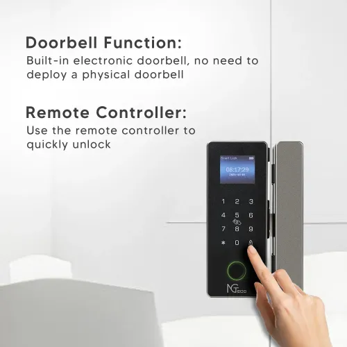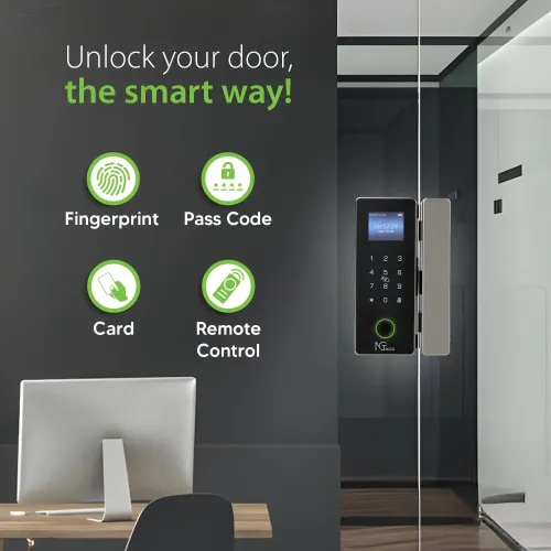 The NGTeco SL04-GL40N Glass Door Lock fits 10–12mm sliding and push-pull glass doors without drilling. Its non-drilling glass mount preserves aesthetics while ensuring stable and professional installation. NGTeco Smart Door Lock supports fingerprint, PIN, RFID card, and mechanical key access methods. The fingerprint capacity accommodates up to 100 users with fast biometric recognition for quick touch-and-go entry. The NGTeco SL04-GL40N Door Lock also supports up to 300 PIN codes and 300 RFID cards. It can pair with up to 16 remote controllers for flexible access control. A 2.8-inch high-resolution LCD display with 640×480 pixels provides clear visuals and simple navigation. The touch keypad with LED indicators enhances visibility and ease of use. Powered by four AA alkaline batteries, the NGTeco Door Lock ensures reliable battery-operated performance. Strong, premium materials enhance durability and deliver a modern, professional appearance. NGTeco SL04-GL40N Smart Glass Door Lock suits office, commercial, and residential applications. It supports multiple users, making it ideal for families, teams, tenants, or shared workspaces. The NGTeco SL04-GL40N Glass Door Lock enables efficient access management with secure authentication. Smart app connectivity is available in model-dependent variants for remote unlocking and monitoring. The NGTeco Smart Door Lock combines biometric security with card and PIN flexibility. Its mechanical key option offers emergency access when needed. NGTeco SL04-GL40N Door Lock balances convenience, security, and clean design for glass entrances. As a reliable NGTeco Door Lock, it provides dependable performance and smooth daily operation.