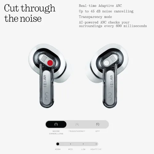 The Nothing Ear (3) Earbuds feature real-time adaptive ANC that reduces noise up to 45dB for a focused listening experience. The system adjusts automatically every 600 milliseconds based on surroundings and sound leakage. Nothing Ear (3) includes Transparency Mode, allowing users to stay aware of their environment when needed. The earbuds use advanced ENC algorithms with three MEMS microphones and a voice pickup unit on each side.