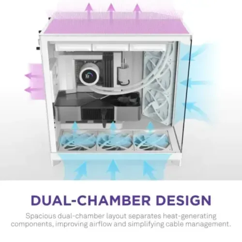 The NZXT H9 Flow Dual-Chamber Mid-Tower Airflow Casing White (2025) is a premium NZXT White Gaming Casing designed for high-performance builds with superior cooling and modern aesthetics. Constructed from SGCC steel and clear tempered glass, this NZXT H9 Flow Casing supports E-ATX, ATX, Micro-ATX, and Mini-ITX motherboards, including rear-connecting BTF and Project Zero designs. With dual-chamber airflow, it accommodates GPUs up to 459 mm, CPU coolers up to 165 mm, and PSUs up to 200 mm, ensuring compatibility with powerful hardware. The case comes with four pre-installed fans—three F140Q (CV) at the front-right and one F120Q (CV) at the rear—delivering optimized airflow with low noise levels. It supports radiators up to 420 mm at the front and top, 360 mm at the bottom, and 120 mm at the rear, making it ideal for advanced liquid cooling setups. Storage options include up to six 2.5" SSDs and two 3.5" HDDs, while seven expansion slots provide flexibility for add-ons. Front I/O connectivity features dual USB 3.2 Type-A ports, a USB 3.2 Gen2x2 Type-C port, and a headset jack for convenience. Combining sleek aesthetics, advanced cooling, and versatile compatibility, the NZXT H9 Flow Dual-Chamber Mid-Tower Airflow Casing White is the ultimate choice for gamers, creators, and PC enthusiasts seeking performance, airflow, and style in their next build.