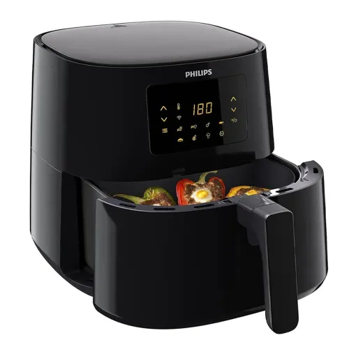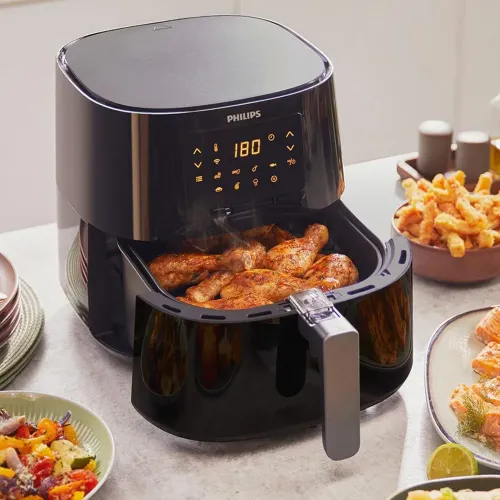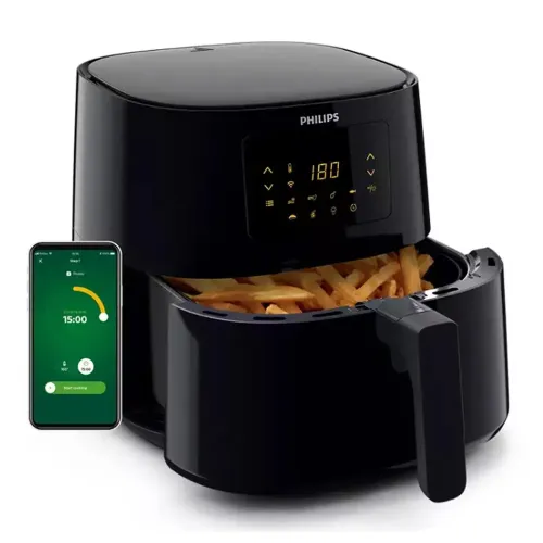 The Philips 5000 Series XL Essential Airfryer is engineered with advanced Rapid Air Technology that uses a unique starfish design to circulate hot air for crispy, golden results with up to 90% less fat. With a generous 6.2L capacity and 1.2Kg basket, this XL air fryer is perfect for preparing up to five portions in one go ideal for families and gatherings. Its 14-in-1 cooking functions let you fry, bake, grill, roast, dehydrate, reheat, and more, while the intuitive touch screen offers 7 smart presets for effortless meal prep. Connected via Wi-Fi and compatible with Amazon Alexa, this smart Philips HD9280/91 6.2L Air Fryer pairs seamlessly with the HomeID App to deliver daily personalized recipe inspiration, step-by-step cooking guidance, and remote monitoring from your phone or tablet. Designed for convenience, it features dishwasher-safe parts, a non-stick QuickClean basket, cool-touch handgrips, and energy-efficient performance that cooks meals up to 50% faster using 70% less energy than traditional ovens. With a sleek black finish, digital interface, adjustable thermostat, and keep-warm function, the Philips 5000 Series XL Essential Air Fryer combines style, innovation, and nutrition making it the ultimate kitchen companion for modern, health-conscious households.