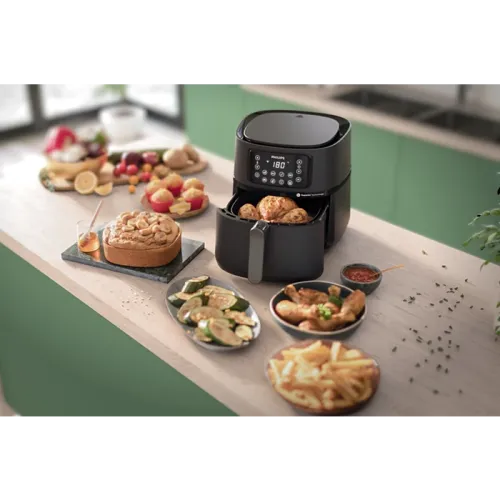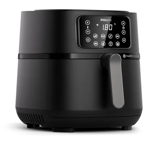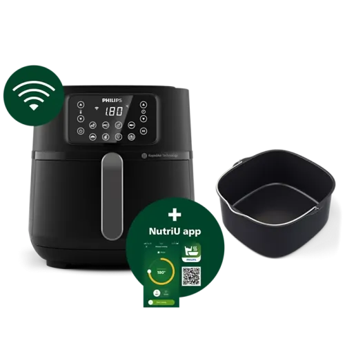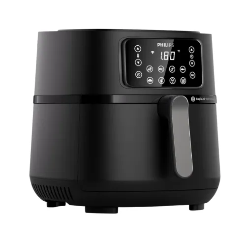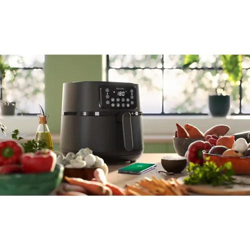 The Philips 5000 Series XXL Connected Airfryer is designed for modern families. This 7.2L (1.4kg) single-basket airfryer combines Rapid Air Technology with seamless connectivity to the intuitive HomeID app, allowing you to fry, bake, grill, roast, dehydrate, and more all with up to 90% less fat. With 16 versatile cooking functions and compatibility with Amazon Alexa, you can select recipes, send instructions to the airfryer, and monitor progress remotely for effortless meal prep. The XXL capacity makes it perfect for preparing up to six portions at once, while the included baking tray adds even more flexibility. Save time and energy up to 60% less energy and 40% faster than traditional ovens without compromising taste or texture. Its sleek digital interface, adjustable thermostat, and dishwasher-safe QuickClean basket ensure easy use and cleanup. Whether you're cooking for family or entertaining guests, the Philips HD9285/93 5000 Series XXL Connected Airfryer delivers crispy, tender results every time, making it a must have appliance for health conscious kitchens.