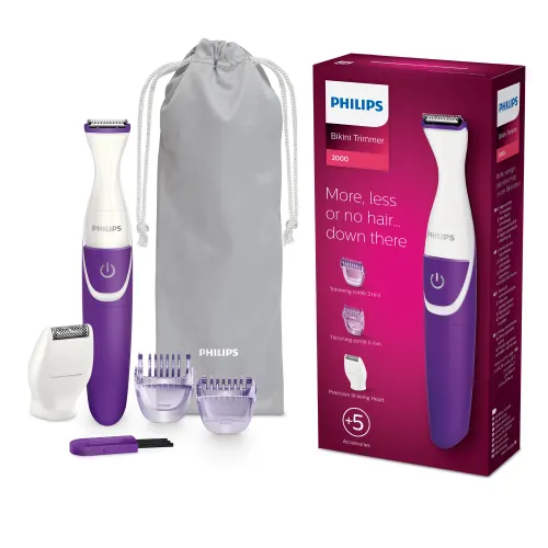The Philips BRT383/15 BikiniGenie Trimmer for Women offers gentle and easy styling for your sensitive bikini area with professional precision. This versatile Philips Bikini Trimmer allows you to trim, shave, and style hair safely for the exact look you desire. Using the small trimming head, the Philips BRT383/15 Trimmer precisely cuts hair down to a sleek 0.5 mm length,. Safety remains a priority because rounded trimming tips protect your skin from painful nicks and cuts during every use,. You can customize your style using two click-on combs that offer grooming lengths of 3 mm and 5 mm,. After trimming, the Philips BikiniGenie Trimmer includes a mini shaving head to achieve a beautifully bare and even smoother look,,. The ergonomic handle of this Philips Trimmer for Women ensures a secure grip for full control during your grooming routine,. As a portable device, the Philips Trimmer is battery-operated and requires no charging cords for ultimate convenience,. The package comes with AA batteries, ensuring your new Philips BRT383/15 BikiniGenie Trimmer is ready for immediate action. Hygiene is simple since the washable trimming head allows for easy cleaning under running water after each styling session,. A specialized cleaning brush is also included to help keep the device perfectly hygienic and free of stray hairs,. This Philips BikiniGenie Trimmer works effectively in both wet and dry conditions, providing flexibility for your personal preferences. You can store all components together in the attractive pouch provided for organized travel and home storage,. Experience more or less hair exactly how you want it with the reliable performance of the Philips BRT383/15 Trimmer.