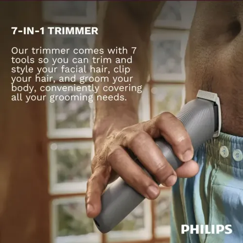 The Philips MG3911/15 3000 Series Trimmer includes seven attachments that help trim beard, cut hair, and groom body areas efficiently. Philips Trimmer uses self sharpening steel blades that stay sharp as day one without requiring blade oil or frequent maintenance. The Philips Trimmer features rounded blade tips that protect skin and ensure a gentle, comfortable trimming experience without irritation or cuts. Philips MG3911/15 3000 Series 7 in 1 Trimmer includes a dedicated nose and ear trimmer for safe and precise removal of unwanted hair. The Philips 3000 Series Trimmer also includes an intimate comb that protects sensitive areas while trimming, ensuring extra comfort and safety. Philips MG3911/15 Trimmer offers multiple length settings from 0.5mm to 5mm with precise 1mm steps for accurate grooming control. The Philips Trimmer provides stubble comb options of 1mm and 2mm, along with beard combs of 3mm and 5mm for versatile styling. Philips Trimmer features an ergonomic grip that ensures better handling, control, and comfort during grooming sessions. The Philips MG3911/15 3000 Series Trimmer includes a durable Ni MH battery that delivers up to 60 minutes of continuous runtime. Philips Trimmer charges fully in 8 hours using USB A charging with 5V input, ensuring convenient power options. The Philips Trimmer includes a charging indicator light that keeps users informed about battery status during charging. Philips 3000 Series Trimmer features rinseable attachments that allow easy cleaning by simply washing under running water. The Philips MG3911/15 3000 Series Trimmer also comes with a cleaning brush for maintaining hygiene and performance.