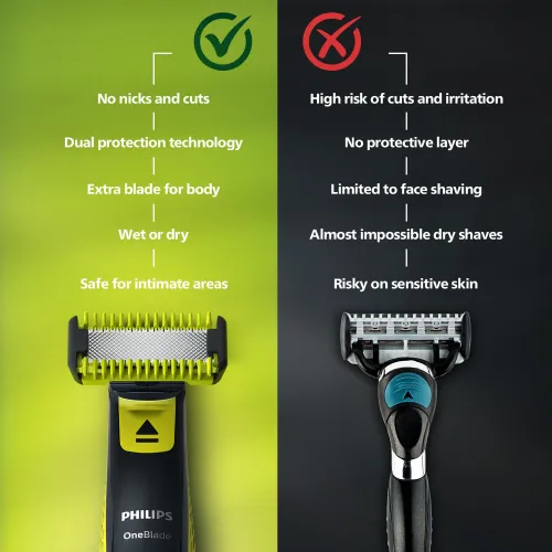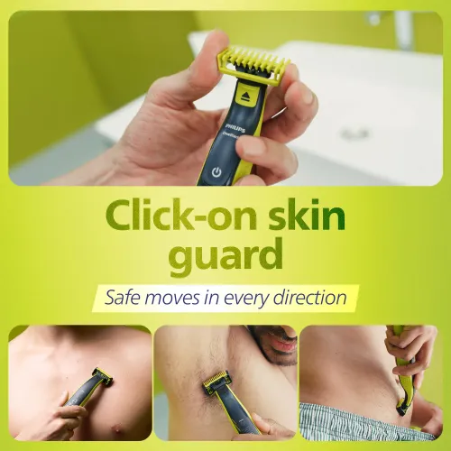 The Philips OneBlade QP2824/10 Trimmer uses unique OneBlade technology with a fast cutter moving 12000 times per minute for efficient performance. Philips OneBlade Shaver features a dual protection system with glide coating and rounded tips that help reduce irritation during shaving. The Philips OneBlade Trimmer easily trims, edges, and shaves while maintaining comfort since it does not cut too close to the skin. Philips QP2824/10 Trimmer includes an original blade with contour following technology that adapts to facial curves for smooth and consistent grooming results. The Philips Trimmer offers a dual sided blade that allows precise edging and flexible shaving in both directions for better visibility. Philips OneBlade Trimmer and Shaver includes three click on stubble combs with 1mm 3mm and 5mm options. The Philips OneBlade QP2824/10 Trimmer also includes a 5 in 1 adjustable comb and a 3mm body comb for versatile styling. Philips OneBlade Shaver comes with a click on skin guard that protects sensitive areas during grooming sessions. The Philips OneBlade Trimmer includes two blades designed separately for face and body grooming convenience. Philips QP2824/10 Trimmer offers durable stainless steel blades that last up to four months with a replacement indicator for timely maintenance. The Philips Trimmer supports wet and dry use with IPX7 waterproof design, allowing easy cleaning under running water. Philips Trimmer and Shaver runs on a rechargeable Ni MH battery with 45 minutes runtime. The Philips Trimmer charges fully in eight hours using USB A charging with automatic 5V voltage support. Philips OneBlade QP2824/10 Shaver features an ergonomic handle with lime green and charcoal grey finish for comfortable grip.