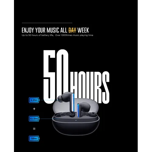 Battery endurance is a standout feature of the Tecno Sonic 1 earbuds, offering up to 50 hours of total playtime. Each charge provides 6.5 hours of continuous use, while the charging case adds an impressive 43.5 hours. This makes the Sonic 1 perfect for travel, work, or leisure without worrying about frequent recharging. Equipped with USB Type-C fast charging, users can quickly power up and resume listening within minutes. The long-lasting battery eliminates anxiety, ensuring uninterrupted music, calls, or gaming sessions. With such dependable performance, the Tecno Earbuds are a reliable companion for both entertainment and productivity.