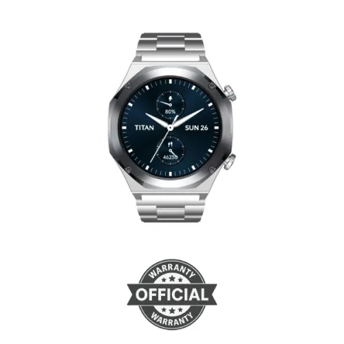The Titan Maestro Premium Smart Watch is a sophisticated wearable that seamlessly blends classic luxury with advanced digital functionality. It is equipped with a vibrant 1.43-inch Super AMOLED display that offers a high-resolution viewing experience of 466 by 466 pixels, delivering crisp visuals and smooth transitions with a 60Hz refresh rate. With up to 650 nits of brightness, the screen remains clear and easily readable in bright sunlight, while the toughened glass ensures durability and long-term scratch resistance. The Always-On-Display feature enhances usability by allowing users to glance at time and notifications without waking the screen. Designed with a round stainless steel case, the watch measures 47mm in width, 50mm in length, and has a slim 10.5mm thickness, paired elegantly with a stainless steel strap and a secure push button clasp, giving it a polished and premium look suitable for both formal and active wear. Internally, the smartwatch houses a 350mAh battery that delivers up to 10 days of battery life on a single charge, making it ideal for extended use without frequent recharging. It supports fast charging and reaches full capacity in just around 2 hours. The Titan Maestro Smart Watch connects via Bluetooth version 5.3, offering a stable and efficient wireless experience for Bluetooth calling, AI voice assistant commands, music and camera controls, and seamless syncing with smartphones. It is compatible with both Android and iOS platforms, expanding its usability across devices. Built to withstand daily challenges, it is IP68 water resistant, making it suitable for workouts, showers, and wet weather conditions. The watch comes equipped with multiple smart sensors that monitor heart rate, blood oxygen (SpO2), sleep patterns, sports activity, and even includes guided breathe exercises, making it a comprehensive health and wellness companion. The Titan Health platform provides centralized access to all health data for easy monitoring and goal tracking. Other smart features include support for over 150 stylish and customizable watch faces, including immersive 3D options, real-time weather display, Do Not Disturb (DND) mode, adjustable sound and vibration alerts, and a crown button for easy navigation. Whether you’re managing calls on the go, checking health metrics, or customizing your style, the Titan Maestro Premium Smart Watch delivers a complete smartwatch experience wrapped in a timeless, elegant design.