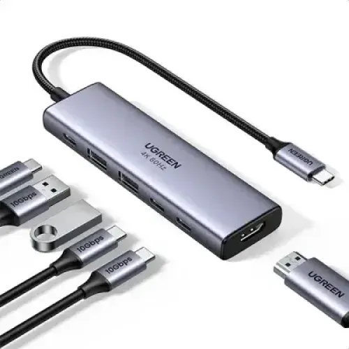 The Ugreen CM511 6-in-1 Type-C Multifunction Hub is a strong and attractive connection solution for Type-C-enabled laptops, tablets, and smartphones. The Ugreen CM511 6-in-1 Type-C Hub (Model: Ugreen CM511 Type-C Hub #35999) has a USB 3.2 Type-C male input and multiple output interfaces, including two USB-A 3.2 ports, two USB-C 3.2 ports, one HDMI 2.0 port, and one 100W Power Delivery (PD) port for fast charging and efficient connectivity. Users may experience lightning-fast data transfers and flawless multitasking thanks to transfer speeds of up to 10Gbps (USB 3.2 Gen2). The HDMI 2.0 output can handle an astonishing 4K resolution at 60Hz, making the Ugreen CM511 Multifunction Hub perfect for high-quality video output, streaming, and professional display. Its high-aluminum alloy construction and metallic finish offer outstanding durability, heat dissipation, and a sleek look. The Ugreen CM511 6-in-1 Type-C Multifunction Hub is an essential accessory for anybody wishing to enhance their connectivity in a small, high-performance design.