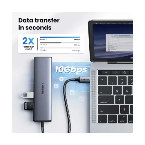 The Ugreen CM512 6-in-1 Type-C Multifunction Hub is a strong yet small connection solution for current laptops, tablets, and smart devices. This Ugreen CM512 6-in-1 Multifunction Hub (Model: CM512, MPN: 45320) has a USB 3.2 Type-C male input that expands your connectivity with multiple output options, including one USB-A 3.2 (10Gbps), one USB-A 2.0, two Type-C 3.2 (10Gbps), and an RJ45 Ethernet port that supports 10/100/1000Mbps for a stable and fast network connection. It also includes a Type-C PD connection that accepts DC 5V power input, allowing it to charge and transmit data simultaneously. The Ugreen CM512 Hub #45320 boasts an amazing transfer speed of up to 10Gbps, making it excellent for file sharing, media streaming, and multitasking. The Ugreen CM512 Multifunction Hub #45320 is plug-and-play, requires no drivers, and uses USB 3.2 technology for dependable performance. Its lightweight, travel-friendly design makes it convenient to transport, whether for workplace, study, or travel purposes. The Ugreen CM512 6-in-1 Type-C Multifunction Hub, with its solid network connection, small design, and increased productivity, is the ideal accessory for professionals looking for speed, adaptability, and simplicity in one streamlined gadget.