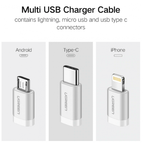 • UGreen 50202 USB 2.0 to Micro USB+Lightning+Type C (3 in 1) Data Cable with Braid Sliver 1M