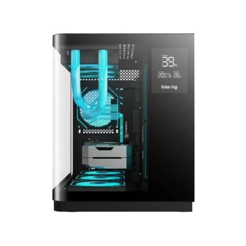 The Value‑Top ARKVIEW RDF6 Micro ATX Gaming Casing is a premium mid‑tower designed for gamers who want durability, cooling efficiency, and striking ARGB aesthetics in a compact build. Made from A‑grade SPCC steel with 0.8 mm thickness, it features a front curved glass panel and tempered glass side panel to showcase your components in style. Supporting Micro ATX and ITX motherboards, the Value Top Gaming Casing measures 410 × 287 × 361 mm and offers clearance for CPU coolers up to 165 mm in height and graphics cards up to 390 mm in length, making it suitable for high‑performance builds. Cooling is a standout feature, with support for 3 × 120 mm fans or a 360 mm radiator on top, 2 × 120 mm slanted fans near the motherboard, 3 × 120 mm fans at the bottom, and 1 × 120 mm fan at the rear, while six pre‑installed Infinite Mirror ARGB fans with a 10‑port control board and Aurora cable deliver vibrant airflow and lighting. Storage options include HDD ×1 + SSD ×3 or HDD ×1 + SSD ×2, ensuring flexibility for modern setups. External connectivity is streamlined with 1 × USB 3.0, 1 × USB 2.0, and HD audio ports on the front panel, while an integrated temperature display adds a premium touch for monitoring system performance. Designed to support ATX PSUs, the Value‑Top ARKVIEW RDF6 Gaming Casing combines durability, cooling power, and ARGB aesthetics, making it an excellent choice for gamers seeking a compact yet powerful solution. Optimized for catalog SEO, this model is highlighted with keywords like Value‑Top ARKVIEW RDF6 Gaming Casing, Value‑Top Gaming Casing, and Value‑Top Casing with Display, ensuring visibility and appeal for e‑commerce listings.