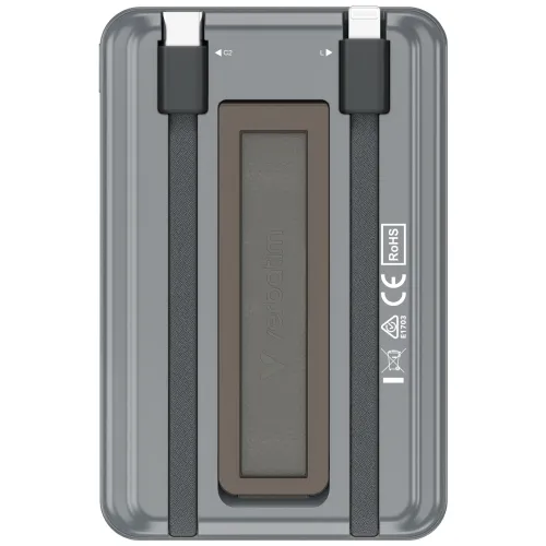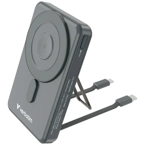 The Verbatim WPBS5in110 10000mAh Magnetic Wireless Power Bank is a versatile and high-performance charging solution designed for modern mobile devices. With a large 10000mAh capacity, this Verbatim WPBS5in110 Wireless Power Bank ensures multiple full charges for smartphones, smartwatches, and other portable gadgets. Its USB-C1 PD 3.0 input supports fast recharging at 5V⎓2.4A, 9V⎓2A, and 12V⎓1.5A (18W max), allowing the power bank itself to be replenished quickly. On the output side, both USB-C1 and USB-C2 PD 3.0 ports deliver up to 20W max with 5V⎓2.4A, 9V⎓2.22A, and 12V⎓1.67A, ensuring rapid device charging. In addition, the Verbatim WPBS5in110 Power Bank supports Lightning output at 5V⎓2.4A (12W max) and wireless charging at 5W, 7.5W, 10W, and 15W (15W max), making it highly compatible with Qi-enabled devices. It also provides up to 2.5W output for smartwatches, covering a wide range of wearable tech. Designed with practicality in mind, the power bank features a sleek gray finish, compact dimensions of 107mm x 69.8mm x 19.5mm, and a lightweight 215g profile, making it ideal for on-the-go charging. With its Type-C interface, the Verbatim WPBS5in110 Wireless Power Bank ensures universal connectivity, positioning it as a reliable, multi-functional power accessory for everyday use.