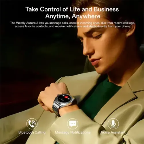 The Weofly Aurora 2 AMOLED Bluetooth Calling Smart Watch is a premium wearable designed for users who want advanced technology with a stylish design. The Weofly Aurora 2 features a 1.32-inch AMOLED display with 466x466 resolution, delivering sharp visuals and vibrant colors. Built with a stainless steel unibody, the Weofly Aurora 2 offers durability and elegance. A 350mAh battery ensures 5-7 days of usage and up to 30 days of standby time, with fast charging completed in just 2 hours. Compatible with iOS 9.0+ and Android 5.0+, the Weofly Aurora 2 is flexible and user-friendly. At 128g, it is lightweight and comfortable, with three functional buttons for smooth navigation.