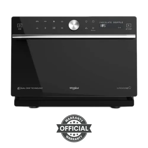 The Whirlpool Supreme Chef 35L Microwave Oven is a state-of-the-art kitchen solution designed for modern households that demand both style and functionality. Boasting a spacious 35-liter capacity, the Whirlpool Supreme Chef 35L Oven allows you to prepare large meals with ease, making it perfect for family gatherings, festive cooking, or everyday use. This versatile appliance offers multiple cooking modes, including Microwave (MW), Grill, Crisp, Steam, and Convection, enabling you to bake, grill, steam, crisp, or reheat your favorite dishes effortlessly. Its 1200W maximum output delivers fast, uniform cooking, while the innovative DualCrisp Technology ensures perfectly golden, crispy results for pizzas, pastries, and oven-fried foods. The oven’s brushed inox frame, tinted + inox skin, and drop-front door with handle combine modern aesthetics with practical usability, enhancing your kitchen décor. Equipped with a 360 mm turntable, Inox cavity finish, and Cavity Dual Crisp Emitter Plates, the Whirlpool Supreme Chef Microwave Oven guarantees even heat distribution and superior cooking performance. The digital LED display panel with electronic controls, timer function, and in-built clock allows precise cooking management, supporting features like precision bake, soft melting, yogurt fermentation, dough rising, and effortless defrosting and reheating. With an input power of 2000W and maximum microwave output of 900W, the Whirlpool Supreme Chef Oven combines efficiency and power, reducing cooking time without compromising results. Finished in elegant silver, this microwave oven is designed not only to perform but also to elevate the style of your kitchen, making the Whirlpool Supreme Chef 35L Microwave Oven a complete solution for versatile, modern cooking needs.