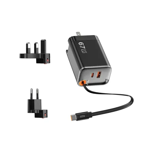 The WiWU Helix Pro Wi‑G027 67W Dual Port GaN Charger with Built‑in Type‑C Cable is a powerful and travel‑ready charging solution that combines advanced GaN technology with compact portability. Made from durable PC V‑0 material with metallic paint, this WiWU 67W Charger delivers fast and efficient charging for laptops, tablets, and smartphones. It features a retractable 70cm Type‑C cable for convenience, alongside USB‑C and USB‑A ports that support multiple fast‑charging protocols including PPS, PD3.0, QC4+, QC3.0, FCP, and AFC, ensuring universal compatibility. Capable of charging up to three devices simultaneously, the WiWU adapter with Type‑C Cable balances speed and safety with low‑temperature operation and certified protection. Compact in size with a foldable plug and global adapters, this WiWU Charger with Built‑in Cable is ideal for travel, offering reliable performance wherever you go. Combining efficiency, portability, and versatility, the WiWU Helix Pro Wi‑G027 is the perfect choice for users seeking a high‑power fast charger with integrated Type‑C support.