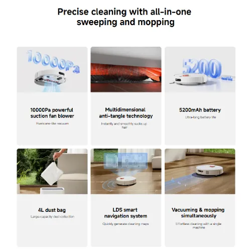 | Others | High-speed rotary mop pad washing Smart return for mop pad washing Vacuuming & mopping simultaneously 5000Pa powerful suction fan blower Laser navigation + obstacle avoidance sensor 4L super-capacity clean water tank Mi Home/Xiaomi Home app remote control 5200mAh high-capacity battery Multidimensional hair anti-tangle V-shaped design Anti-tangle side brush 3 levels for smart water output control Imitates manual cleaning habits Able to handle door thresholds up to 20mm Customised settings for carpets |