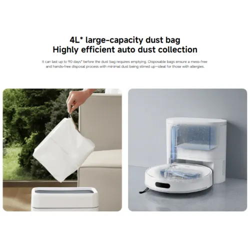 The Xiaomi H40 features a 4L dust bag that can last up to 90 days before disposal. Its hands-free dust collection system is suitable for allergy-sensitive households. Additionally, the Xiaomi H40 includes a 210mL water tank with three adjustable water flow levels. This rechargeable vacuum cleaner imitates manual cleaning habits, offering precise mopping for various stains. The Xiaomi H40 ensures efficient vacuuming and mopping simultaneously, delivering a complete cleaning solution.